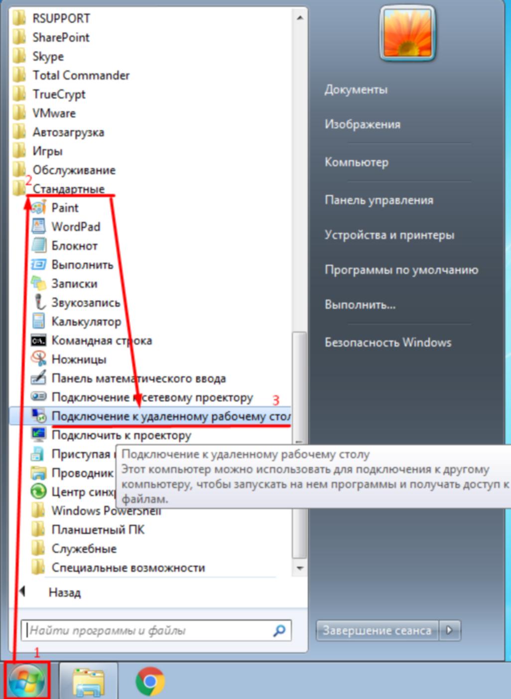 3.Натиснути Пуск - Усі програми - Стандартні - Підключення до віддаленого робочого стола (Мал. 1)