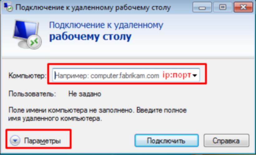 4.В поле Комп'ютер вводимо ip адресу Вашого сервера і порт віддаленого підключення