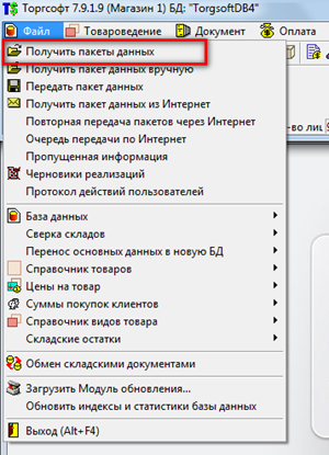 Можна вказати місце збереження переданих пакетів даних на комп'ютері для подальшого завантаження їх в програму. Для цього необхідно вказати назву папки для збереження в поле Каталог прийому пакетів (Мал. 2 (7)) вручну або вибрати папку за допомогою кнопки Огляд папок (Мал. 2 (8)). Для завантаження пакетів даних, необхідно вибрати пункт головного меню Файл - Отримати пакети даних (Мал. 3) і програма завантажить дані з зазначеної папки.